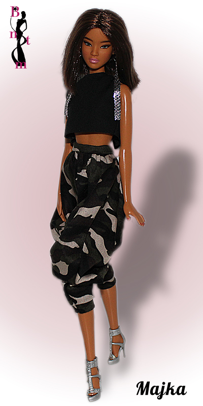 América do Norte : Um visual moderno e ousado, composto por um crop top preto minimalista que valoriza a silhueta. A calça ampla, estilo saruel, exibe uma estampa camuflada em preto, cinza e branco, trazendo um toque urbano e dinâmico ao conjunto. Os acessórios complementam perfeitamente o estilo: brincos longos e prateados brilham com glamour e sofisticação, enquanto as sandálias de salto metálico adicionam um toque elegante e contemporâneo. Esse look mistura com maestria o casual com o chique, representando perfeitamente o espírito vanguardista e cosmopolita do Barbie’s Next Top Model.