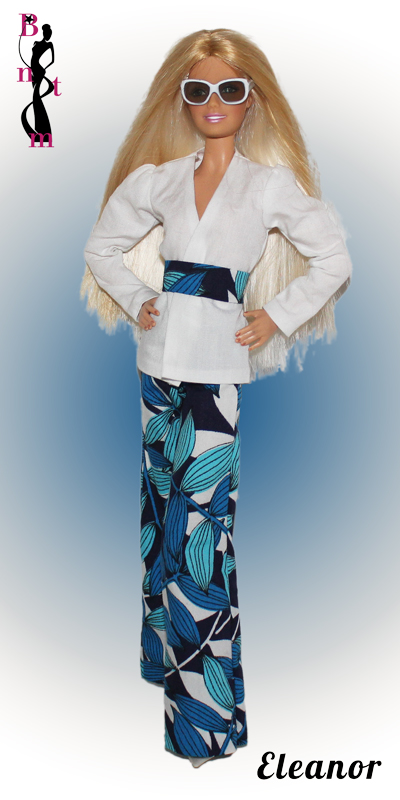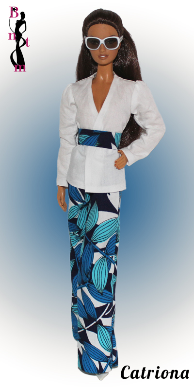 Oceanía : Este conjunto rinde homenaje a Oceanía con un look fresco y sofisticado que captura el espíritu de los paisajes marinos y tropicales de la región. La blusa blanca, de corte elegante y estructurado, presenta un escote en V que resalta una silueta refinada. Va ceñida con una banda de tela azul que recuerda los tonos profundos del océano.