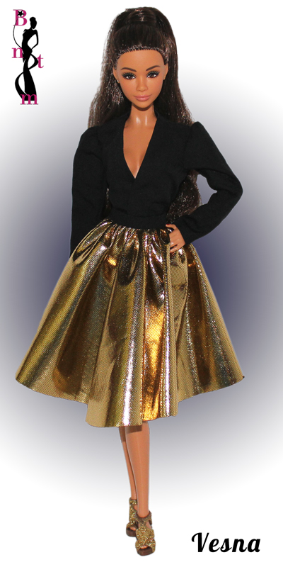 La pièce maîtresse de cette tenue est une jupe midi dorée métallisée, au volume ample et plissé, qui capte la lumière avec éclat à chaque mouvement. Des sandales à talons dorées viennent compléter ce look sophistiqué, alliant féminité, éclat et assurance. Ce style classique et chic, parfaitement équilibré, incarne la grâce moderne de Barbie’s Next Top Model.